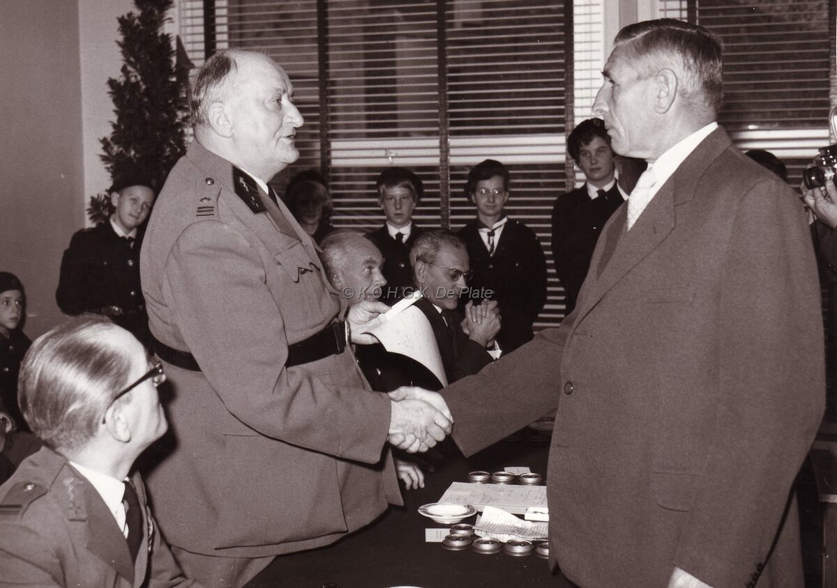 Bij eenkomst van het Rode Kruis in hun lokaal aan de Torhoutsesteenweg,commandant KESTELOOT wordt gelukgewenst door de heer DEWINTER.