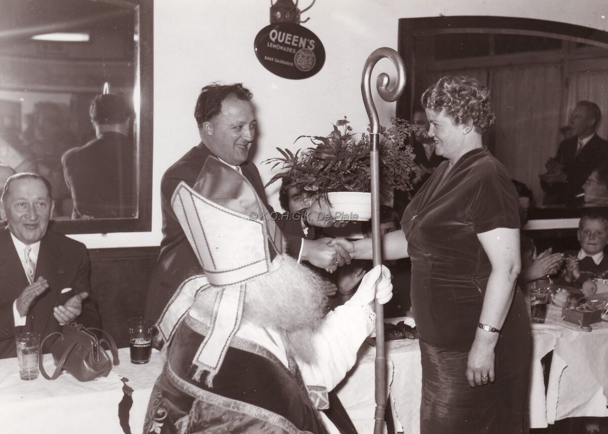 De burgemeester van Bredene, August PLOVIE, overhandigt een bloemstuk aan mevrouw RAMAECKERS tijdens een Sinterklaasfeestje.