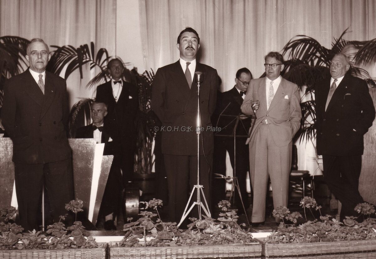 Toespraak door Roger DE KINDER, schepen later gouverneur Provincie Oost-Vlaanderen, links van hem Maurice (?) REYNAERT,rechts een onbekende en Sebastiaan BOUDOLF socialistisch lid van de gemeenteraad in de Noordstar (Jules Peurquaetstraat).