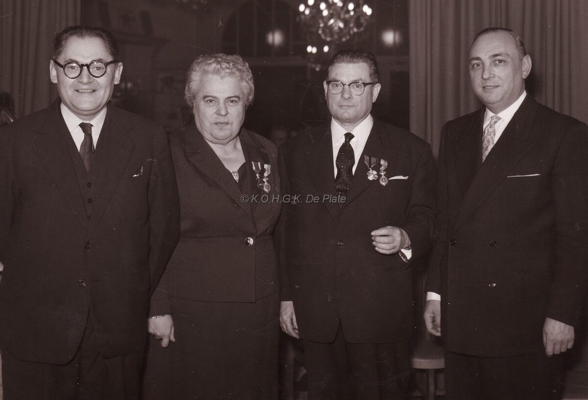 Vereremerking in de kursaal (?) van mevrouw BOGAERT en onbekende heer. Rechts Theo DEHAENE, liberaal voorman.