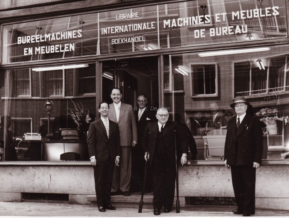 François DEVRIENDT (met krukken) uitbater van de Internationale Boekhandel op de hoek van de A.Buylstraat en de Hertstraat bij de opening van de handelszaak kantoormeubelen en -machines in de Kaaistraat nr. 3. De man in het bleke pak is de schoonzoon HEILMAN, gehuwd met Gilberte DEVRIENDT. Men verkocht er tel- en schrijfmachines, fotokopie- en duplicaatmachines, kantoormeubelen. Met tentoonstellingszaal.