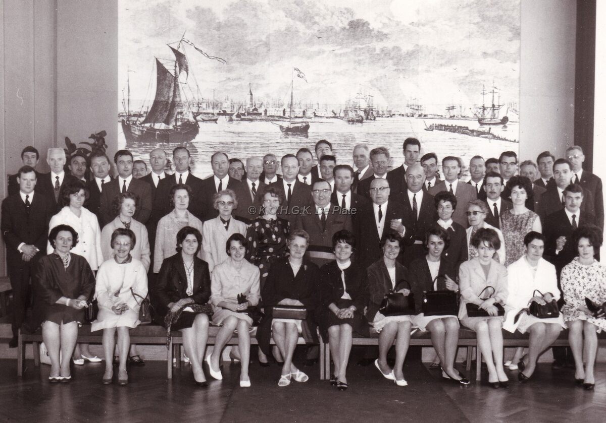 Ontvangst van R.L. PEETERS,concessionnaris catering op de RMT schepen,en zijn personeel op het stadhuis. centraal John LAUWEREINS,waarnemend burgemeester,naast hem (rechts)R.L. PEETERS,dan Kamiel DEHOUCK,schepen,vijfde en zesde van links op de tweede rij John HERMANS,journalist en gemeenteraadslid en Marie-Jozef PORTA,schepen,uiterst rechts Emiel VANSTEENKISTE,gemeenteraadslid (later hoofd politiecommissaris).
