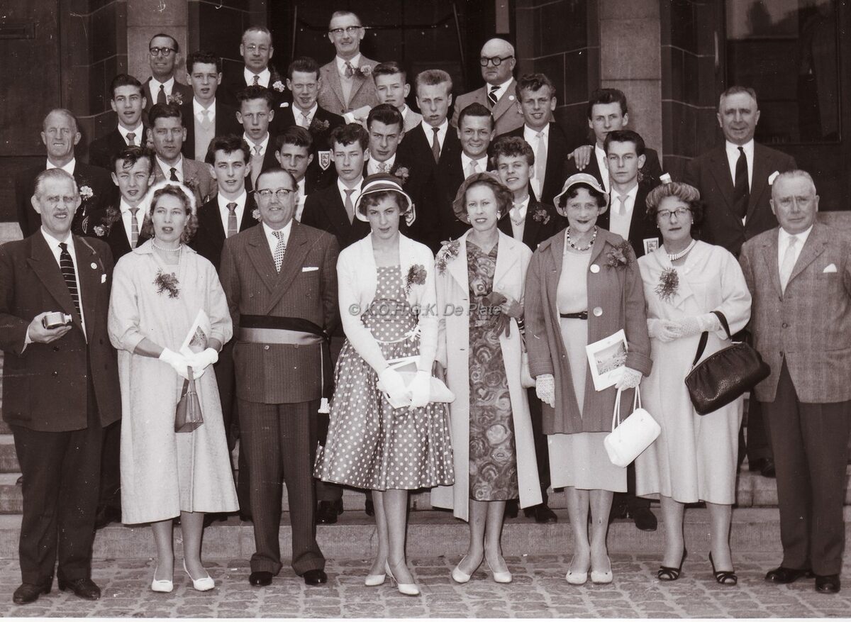 Waarnemend burgemeester John LAUWEREINS op de trappen van het dd. stadhuis (huidig Gerechtshof) bij de ontvangst van Brighton's Hove District school Football Association.