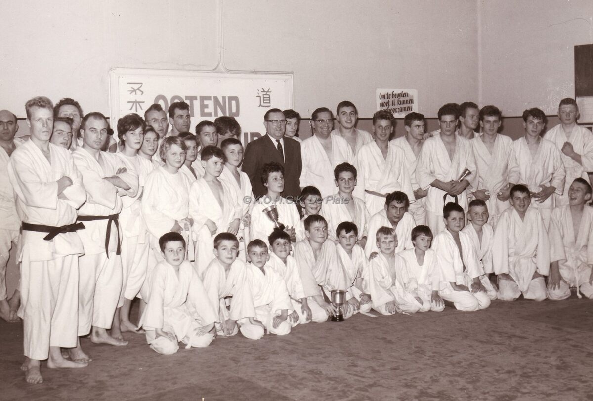 Waarnemend burgemeester John Lauwereins op bezoek bij Ostend Judo Club in hun lokaal aan de Nieuwpoortsesteenweg in de stedelijke basisschool Vercamer. Links vooraan staat Hubert LAUWERS, zwarte dan en bode-inkasseerder bij de stadkas.