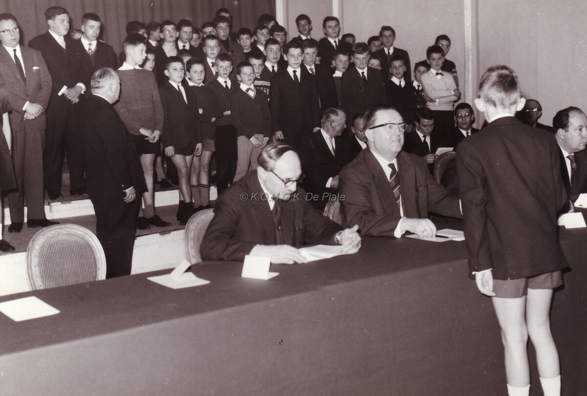 Waarnemend burgemeester John LAUWEREINS bij een prijsdeling in het Kursaal.Uiterst rechts is nog John HERMANs,journalist en gemeenteraadslid te zien.