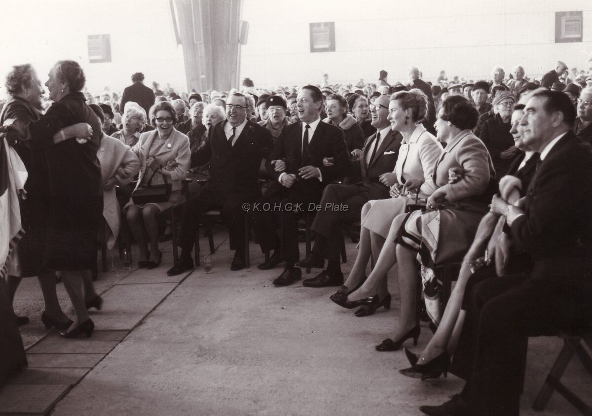 Gezellig samenzijn van bejaarden in het Kursaal.Centraal waarnemend burgemeester John LAUWEREINS die deelneemt aan het jolijt.