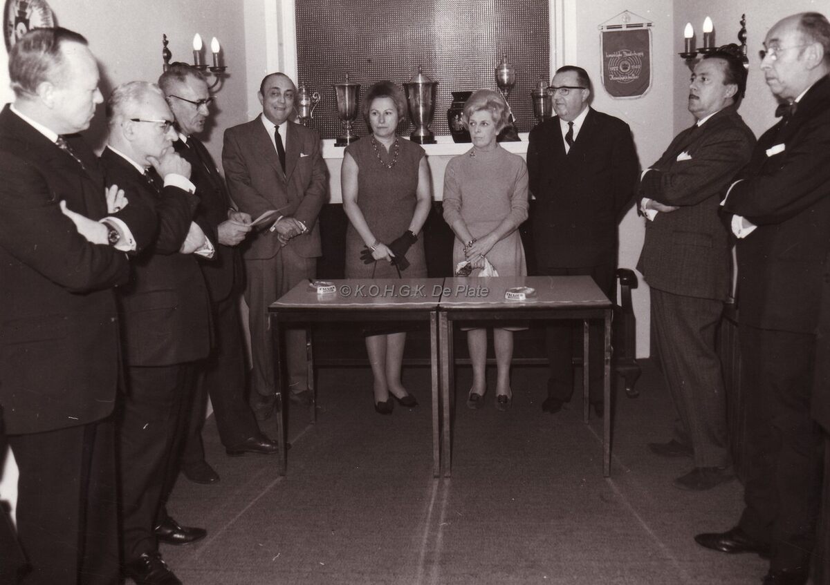 Waarnemend burgemeester John LAUWEREINS bij een huldiging in een schuttersvereniging (?) in de linkse hoek staat Theo DEHAENE,liberaal kopman.