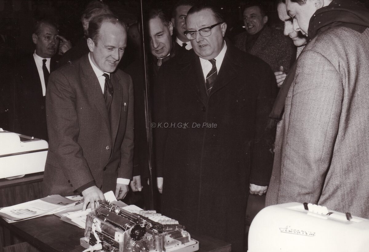 De heer DESCHEEMAECKER demonstreert de werking van een electrische schrijfmachine aan waarnemend burgemeester John LAUWEREINS,achter de rechter schouder van deze laatste staat Alfons LARIDON.