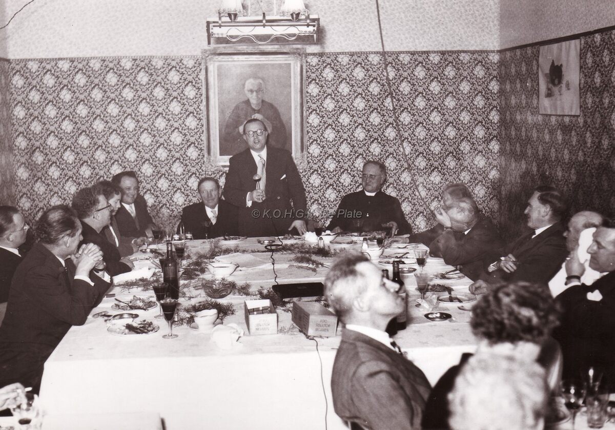 Waarnemend John LAUWEREINS houdt een toespraak op een banket?De tweede links van hem is August PLOVIE,burgemeester van Bredene.