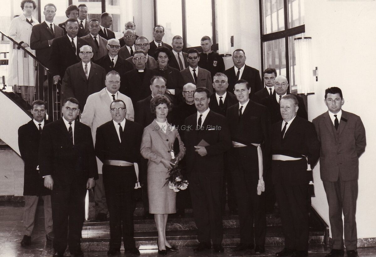 Waarnemend burgemeester John LAUWEREINS tweede van links ontvangt kanaalzwemmer Pierre VANVOOREn en zijn echtgenote op het stadhuis.Uiterst links vooraan Norbert VANDERCRUYSSEN feestleider Mariakerke,rechts van Pierre VANVOOREN,schepenen Jan PIERS en VANDEKIEBOOM dan gemeenteraadslid Marcel FRIEDRICHS.