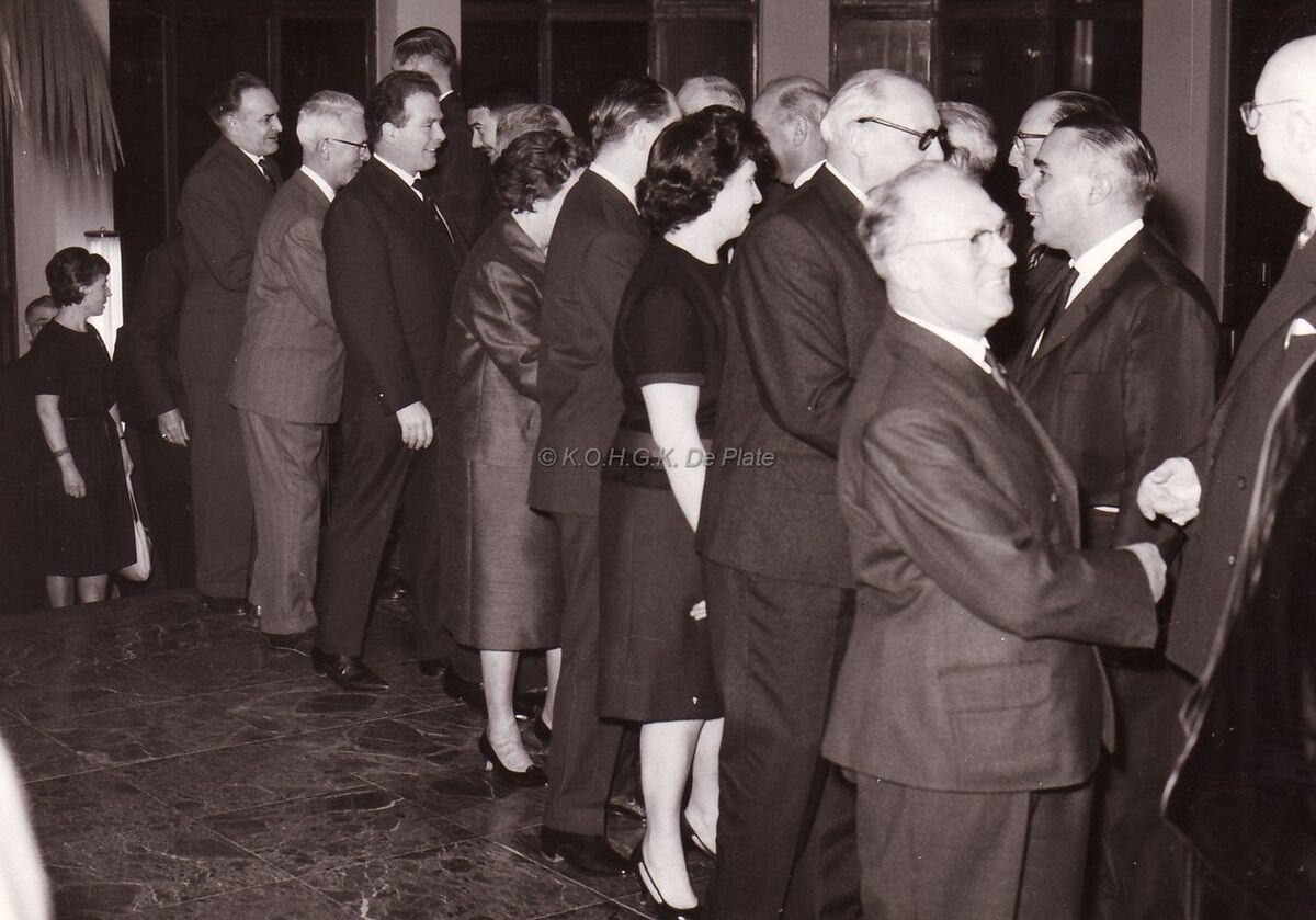 Handjesschuddend het rijtje af,uiterst links Michel SURMONT stadssecretaris,naast hem Raymond MIROIR,schepen en dan JOhn LAUWEREINS waarnemend burgemeester;Foto in het Kursaal (?).