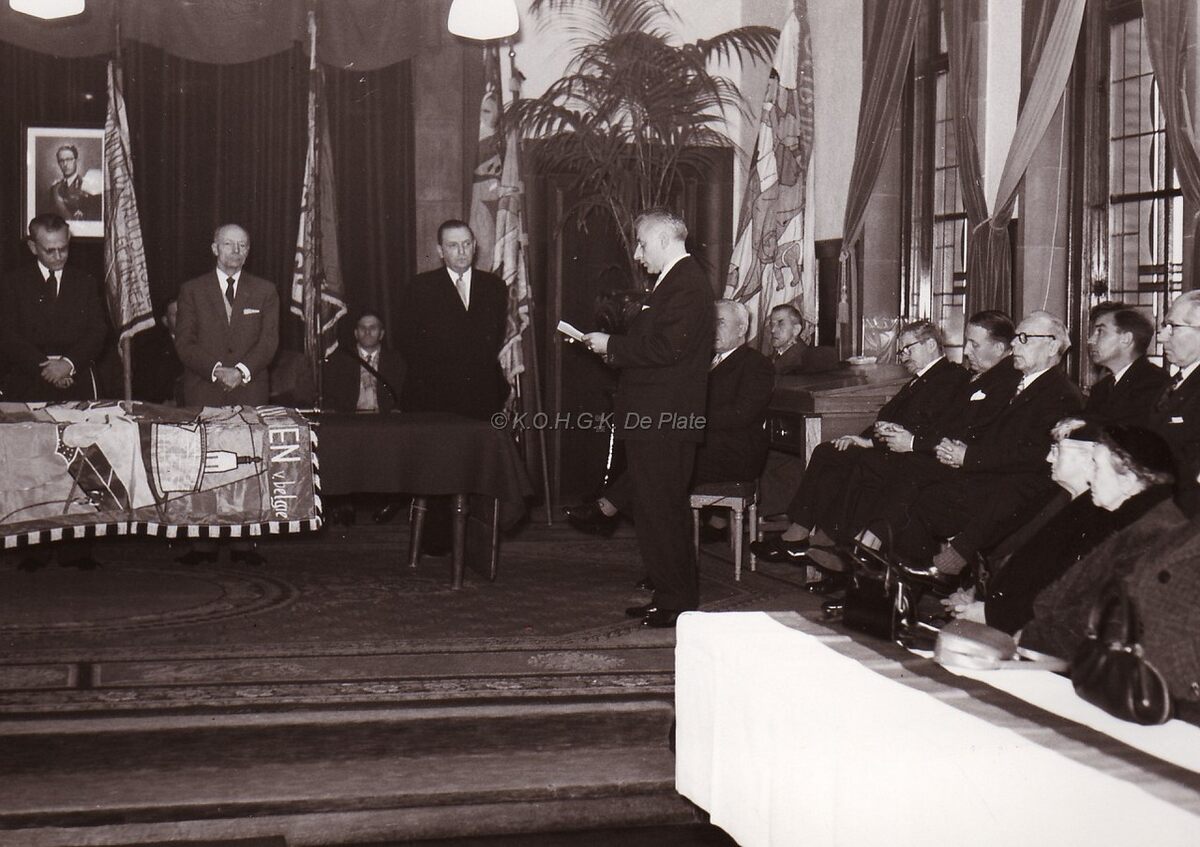 Ontvangst op de dd.stadhuis (huidig Gerechtshof) tweede van links schepen Marie-Jozef PORTA.