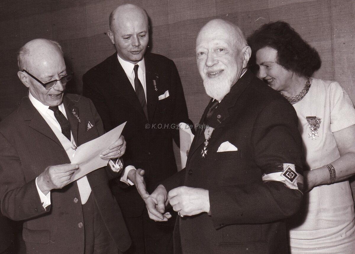 Schepen Marie-Jozef Porta en zijn zoon bij enkele gedecoreerde Leopoldisten (veteranen Leopold III).
