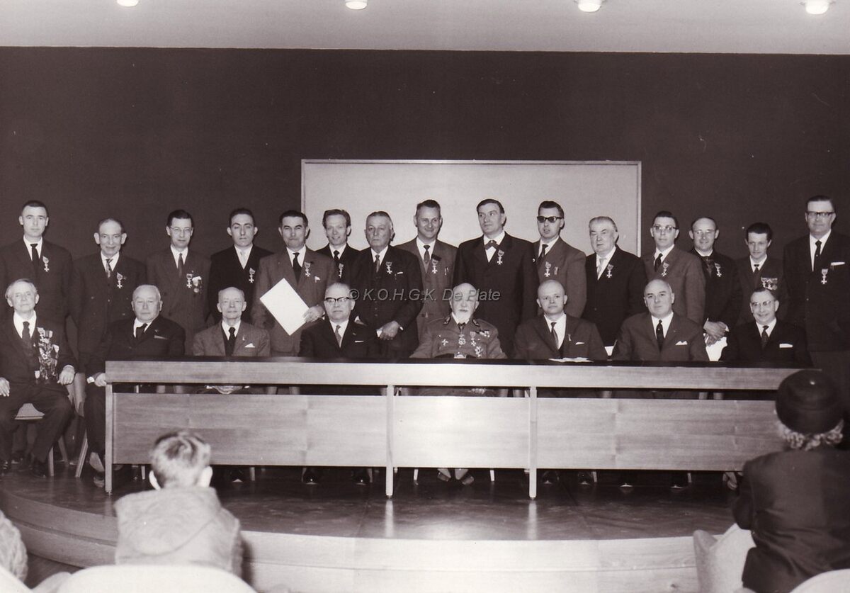 Uitreiking van eretekens in de conferentiezaal van het stadhuis. Aan de tafel zittend centraal een militair (op rust). Tweede van links, Marie-Jozef Porta, tweede van rechts, schepen Maurice Quaghebeur sr. en naast hem Felix Porta.