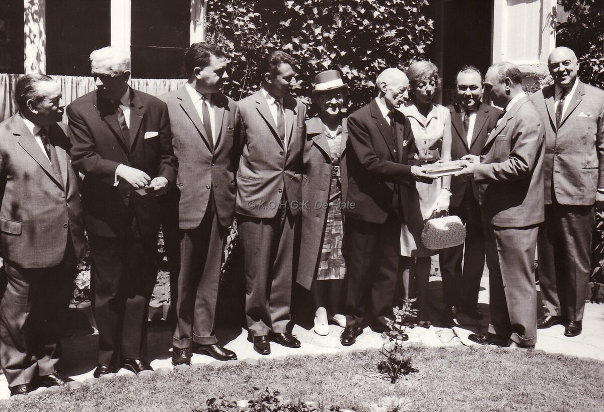 Liberaal onderonsje in de tuin van de ambtswoning van Marie-Jozef Porta, schepen en consul van Monaco, die hier een gedenkboek ontvangt. Rechts, schepen Maurice Quaghebeur sr.. Derde van rechts, Theo Dehaene,liberaal voorman. Vierde van links Marcel Friederichs, gemeenteraadslid .De woning Porta (Huize Monaco) lag aan de Van Iseghemlaan.
