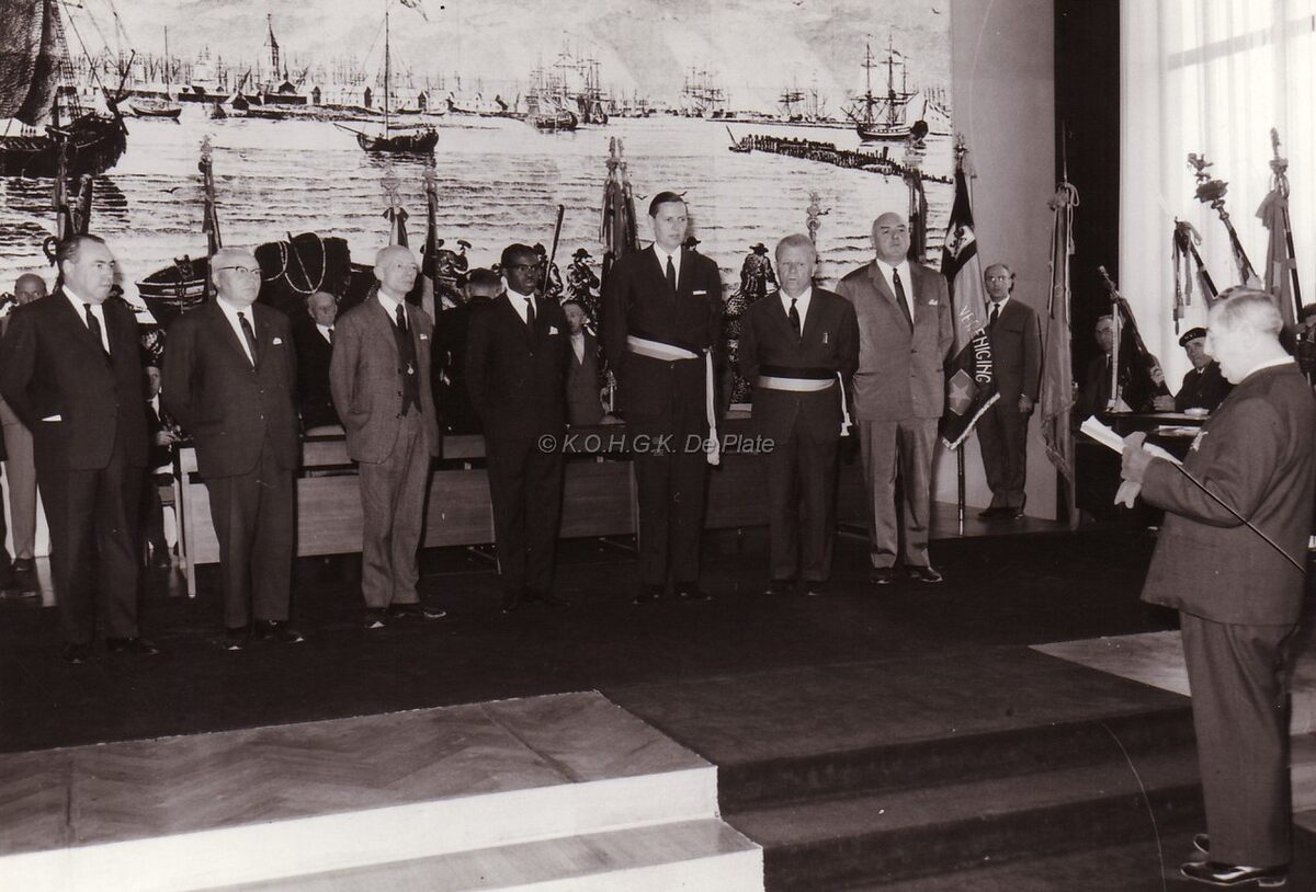 Een vaderlandse vereniging wordt ontvangen op het stadhuisUiterst links Theo DEHAENE liberaal voorman, derde van links Marie-Jozef PORTA,centraal Jan PIERS burgemeester en dan naar rechts schepenen Jozef VAN DEN KIEBOOM en Maurice QUAGHEBEUR.
