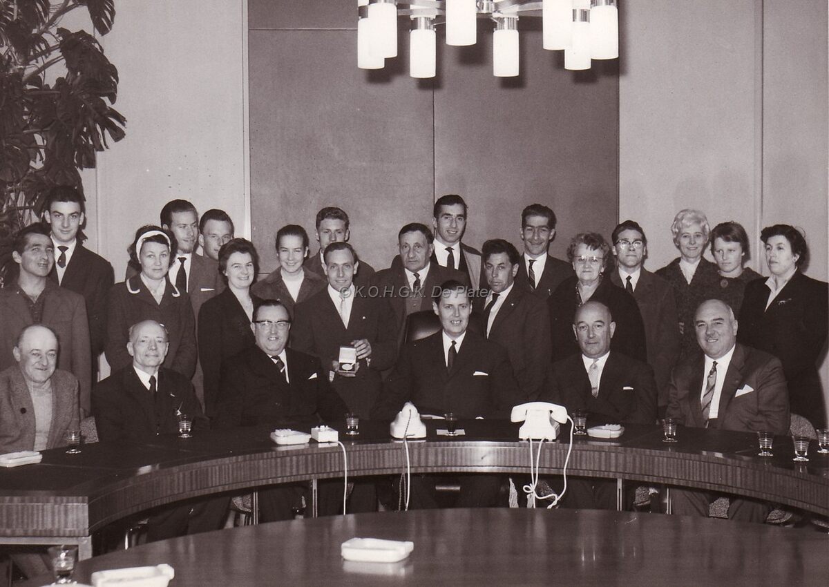 De collegezaal in het stadhuis,burgemeester Jan PIERS (centraal) en het college ontvangen een groep ter gelegenheid van de overhandiging van de stadsmedaille.Zittend van links naar rechts onbekend en dan de schepenen Marie Jozef PORTA,John LAUWEREINS,de burgemeester,en de schepenen Kamiel DEHOUCK en Maurice QUAGHEBEUR.