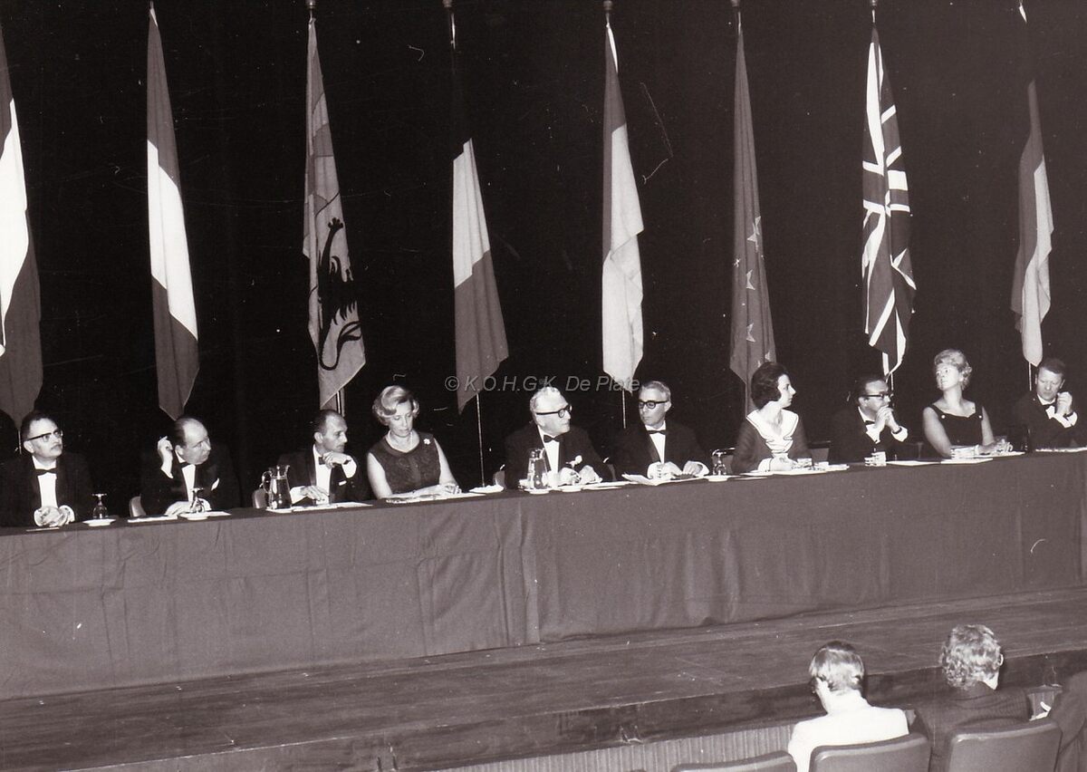 Bijeenkomst in het Kursaal,derde van links schepen Jan FELIX,vijfde schepen Raymond MIROIR,uitsers links Frank EDEBAU stadsconservator,naast hem John HERMANS,journalist en gemeenteraadslid.