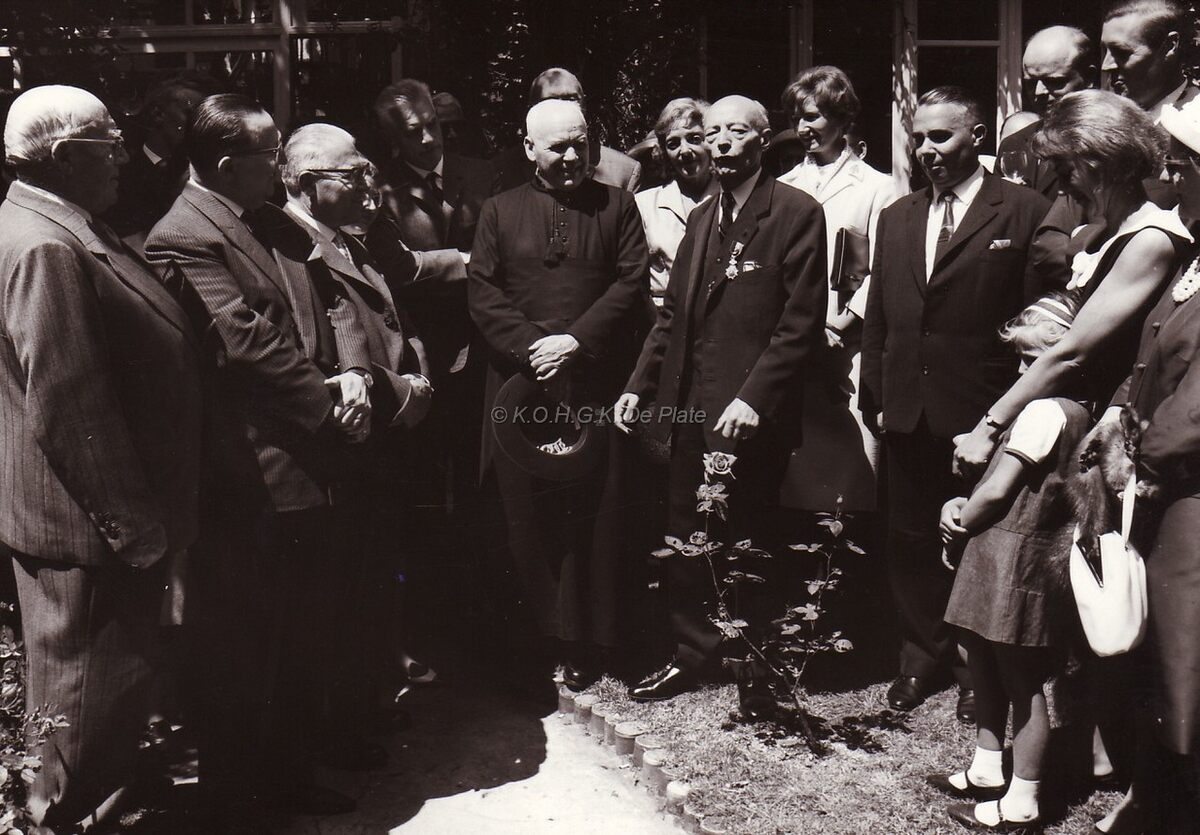 Bijeenkomst in een tuin (deze van Huize Monaco woning van de familie PORTA aan de Van Iseghemlaan?) centraal staat deken BUTAYE,naast hem de vereremerkte schepen Marie-Jozef PORTA dan schepen Raymond MIROIR.Rechtsachter Jan Piers toen schepen en tweede van links John LAUWEREINS waarnemend burgemeester.