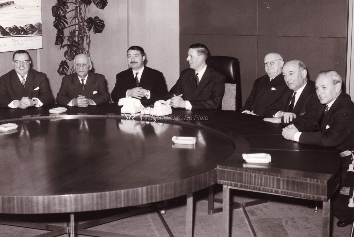 Het Oostends college van burgemeester en schepenen. Van links naar rechts John LAUWEREINS, Henri EDEBAU, Roger DEKINDER, Jan PIERS, Michel SURMONT, stadssecretaris, Kamiel DEHOUCK en onbekende.