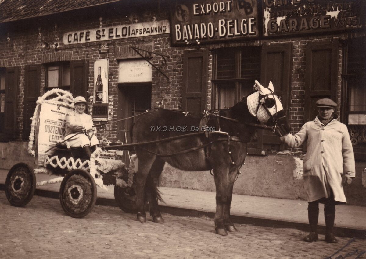 Jockey,kar en paard een reclame voor de Oostendse Revue,voor de afspanning St Eloi van Bertje BONTe aan de Hoge Barriere op de Torhoutse steenweg.