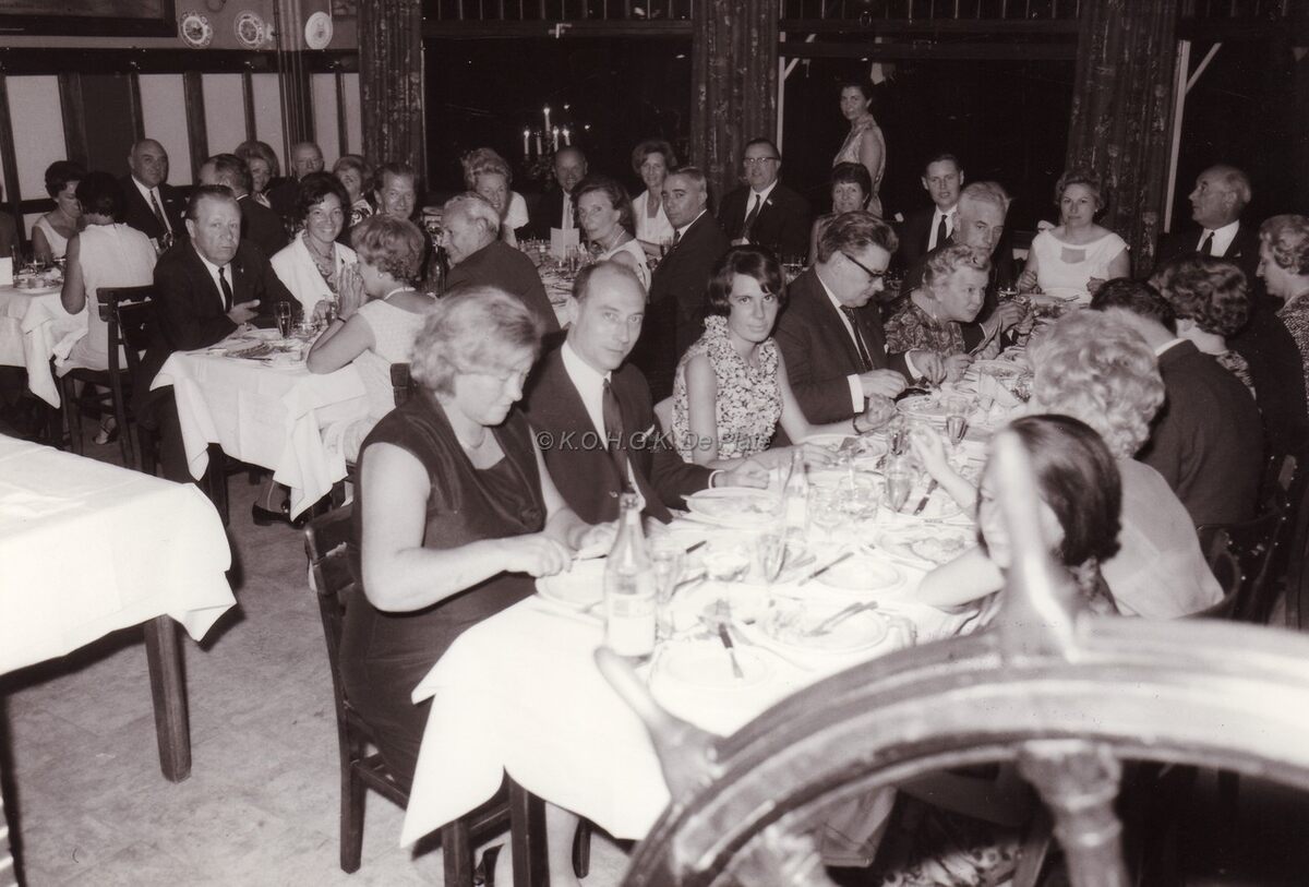 Een banket waarop voornamelijk het oostends politiek personeel aanzit. Aan de eerste tafel tweede van links Fred RIGAUX,diensthoofd toerisme,verder Raoul BONNEL,schepen en Louis VANHOORNE,schepen.Aan de tweede tafel,schepenen Jozef VAN DEN KIEBOOM en Raymond MIROIR,aan de derde Schepenen Maurice QUAGHEBEUR en Marie-Jozef PORTA.Aan de tafel achteraan van links naar rechts schepen John LAUWEREINs,burgemeester Jan PIERs en schepen Kamiel DEHOUCK.