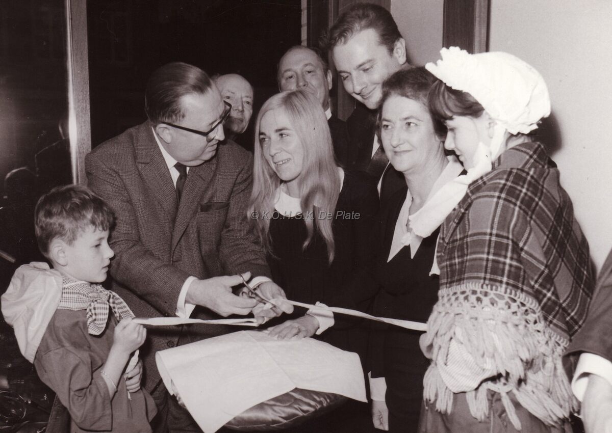 Waarnemend burgemeester John Lauwereins knipt het lint door bij de opening van een tentoonstelling over de visserij. Achteraan de hoofden van schepen Marie-Jozef Porta en journalist John Hermans