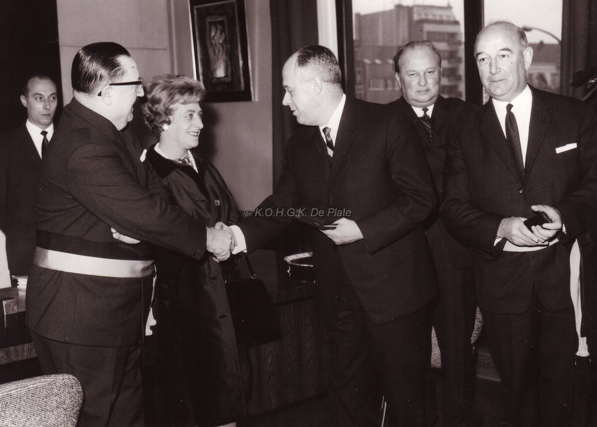 Waarnemend burgemeester John LAUWEREINS, naast hem mevrouw Jozef VAN DEN KIEBOOM, ontvangt E. D'HAENENS op het stadhuis, rechts staat schepen Kamiel DEHOUCK en uiterst links achteraan Fred RIGAUX,hoofd toerisme.