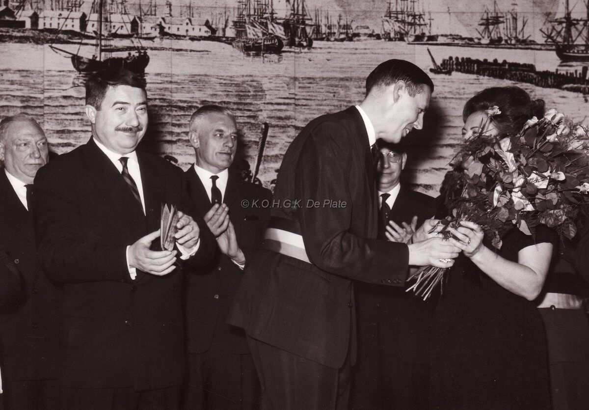Burgemeester Jan PIERS zet een dam in de bloemetjes in de trouwzaal van het stadhuis.verder van links naar rechts gemeenteraadslid Sebastiaan BOUDOLF, schepenen Roger DEKINDER en Louis VANHOORNE.