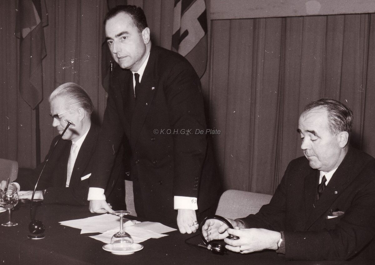 Minister van landsverdediging Paul VANDEN BOEYNANTS houdt een toespraak, links van hem minister Jos DE SAEGER van openbare werken (later volksgezondheid en gezin).