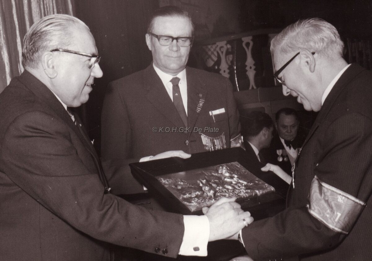 Op een bijeenkomst der Leopoldisten (veteranen Leopold III overhandigt Robert Peeters van de catering pakketboten onder het goedkeurend oog van de heer Devos een lijst aan een onbekende.