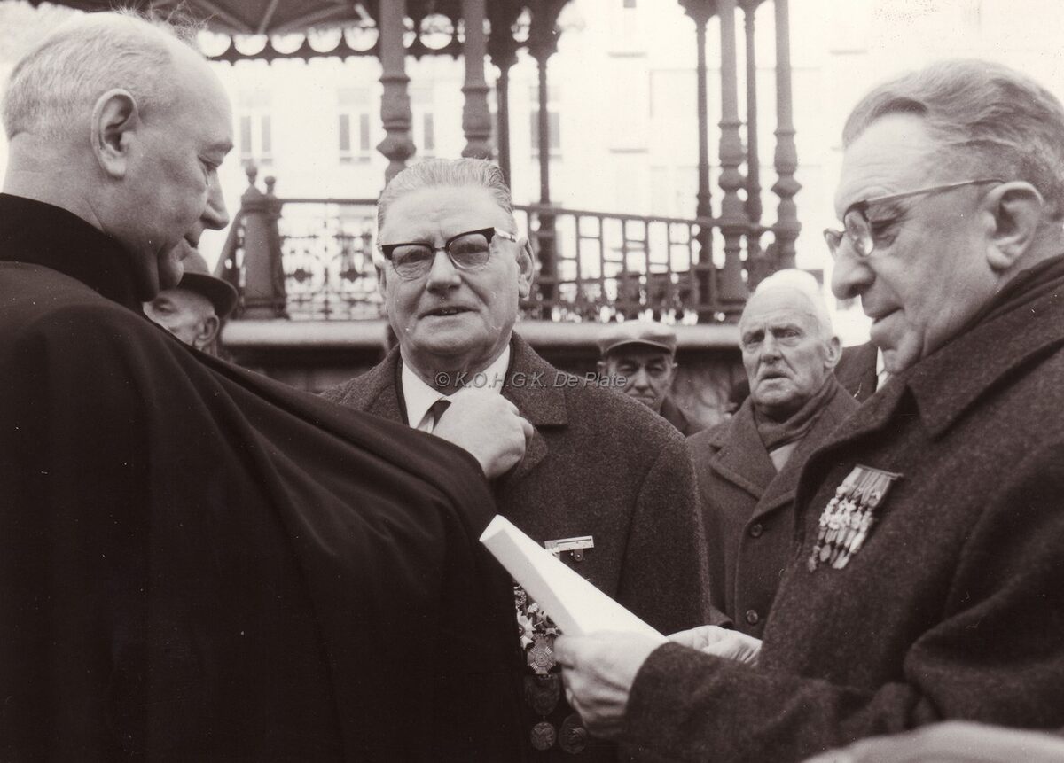 Schepen Kamiel DEHOUCK decoreert een onbekende op het Wapenplein tijdens een vaderlandse plechtigheid (11 november ?).Rechts de voorzitter van de oudstrijdersvereniging ...... DECLOEDT.