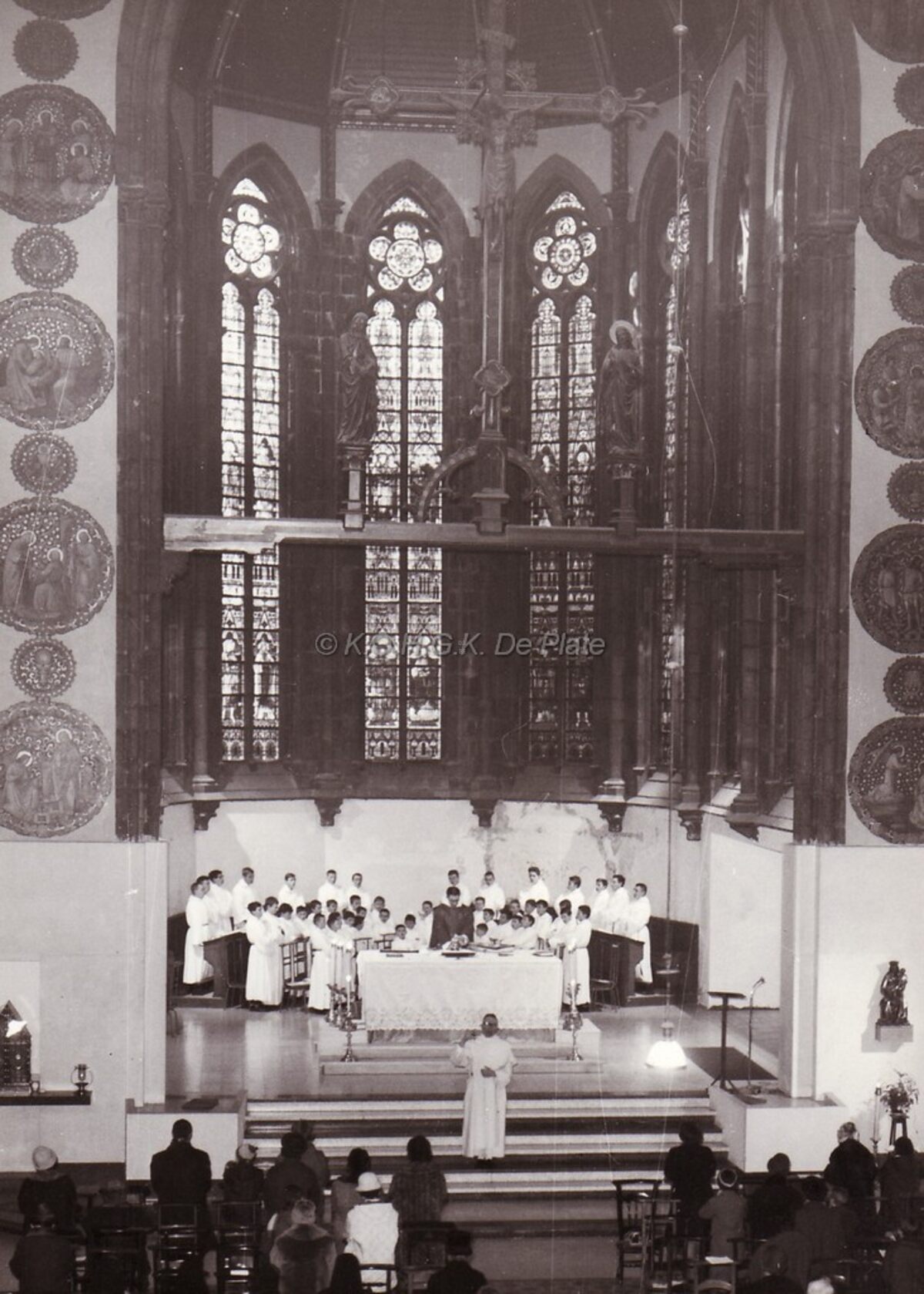 Binnenzicht van de Dominicanenkerk tijdens een misviering. Het koor "Senghet ende Weset Vro" onder de leiding van pater Jozef Ketele