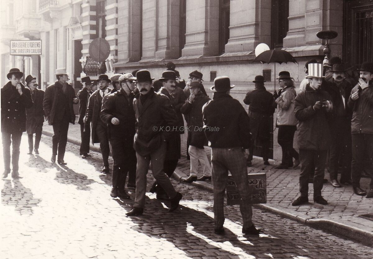 Een groep laatstejaars van het Koninklijk Atheneum tijdens de viering van "hoedjesdag" voor de schoolpoort in de Léon Spilliaertstraat. Links de ingang van biergroothandel E. Roelens.