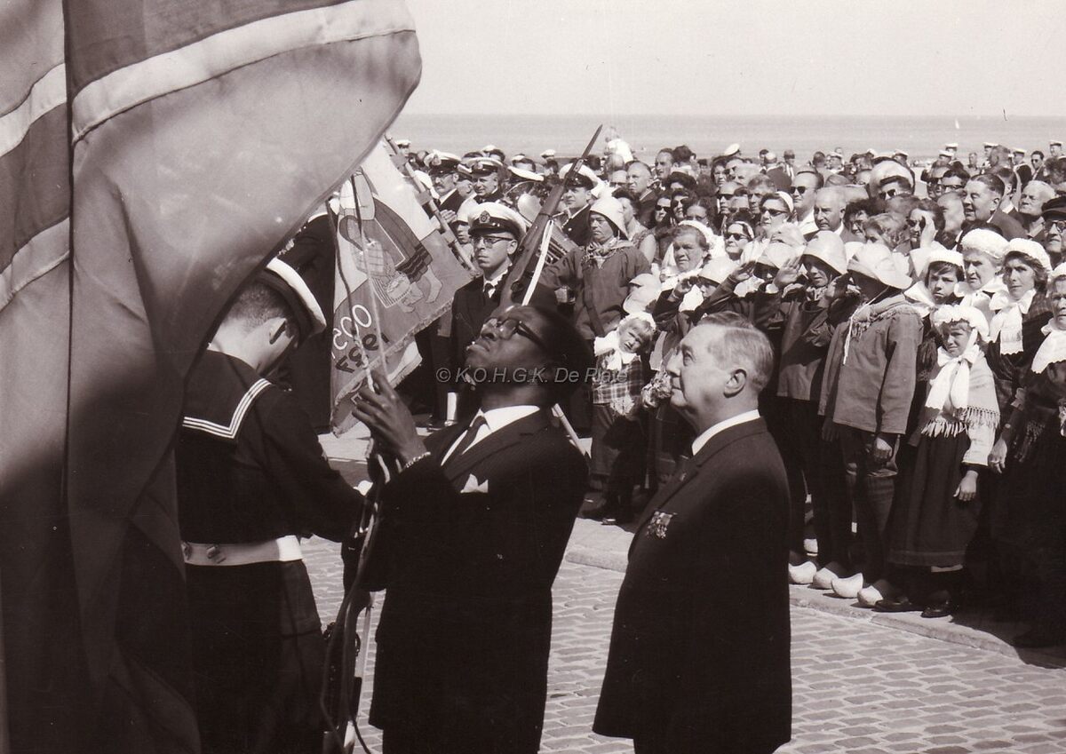 Een donkere medemens hijst een vlag aan het monument van Leopold II aan de drie gapers op de dijk tijdens de koloniale dag der kust.