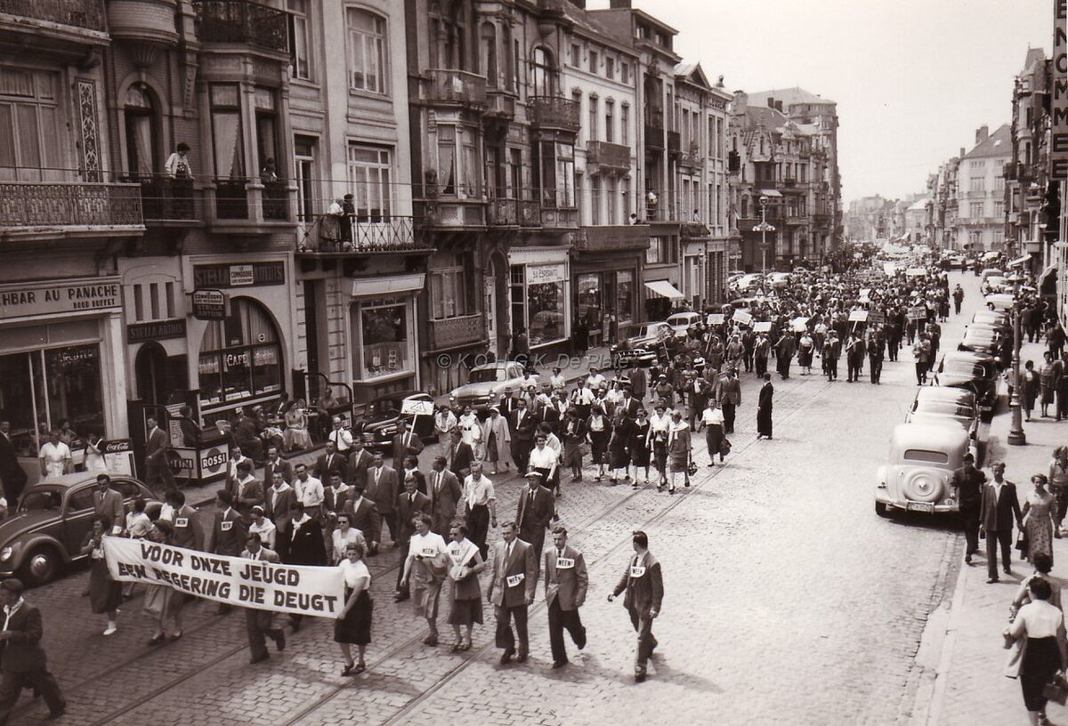 Een optocht betogers op de Van Iseghemlaan tegen aan het kursaal komt voorbij het kruispunt Koningstraat.Waarschijnlijk periode schoolstrijd.