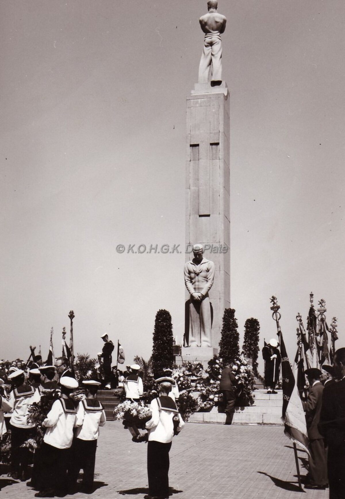 Huldiging aan het monument der zeelieden op het Zeeheldenplein,jongens van de IBIS brengen de bloemen aan.