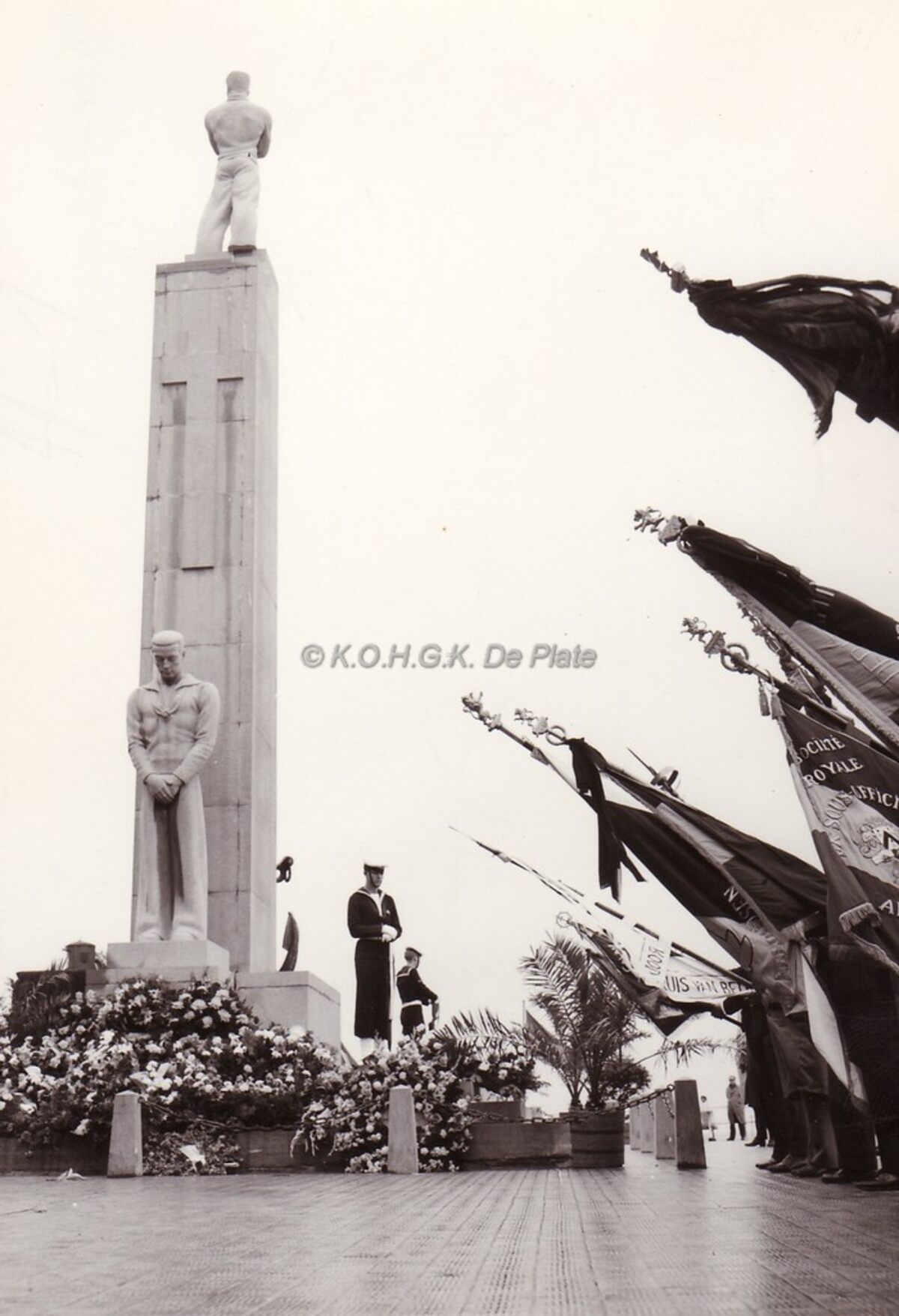 Vaandels groeten tijdens de bloemenhulde op de dag der vissers aan het monument der zeelieden op het Zeeheldenplein.