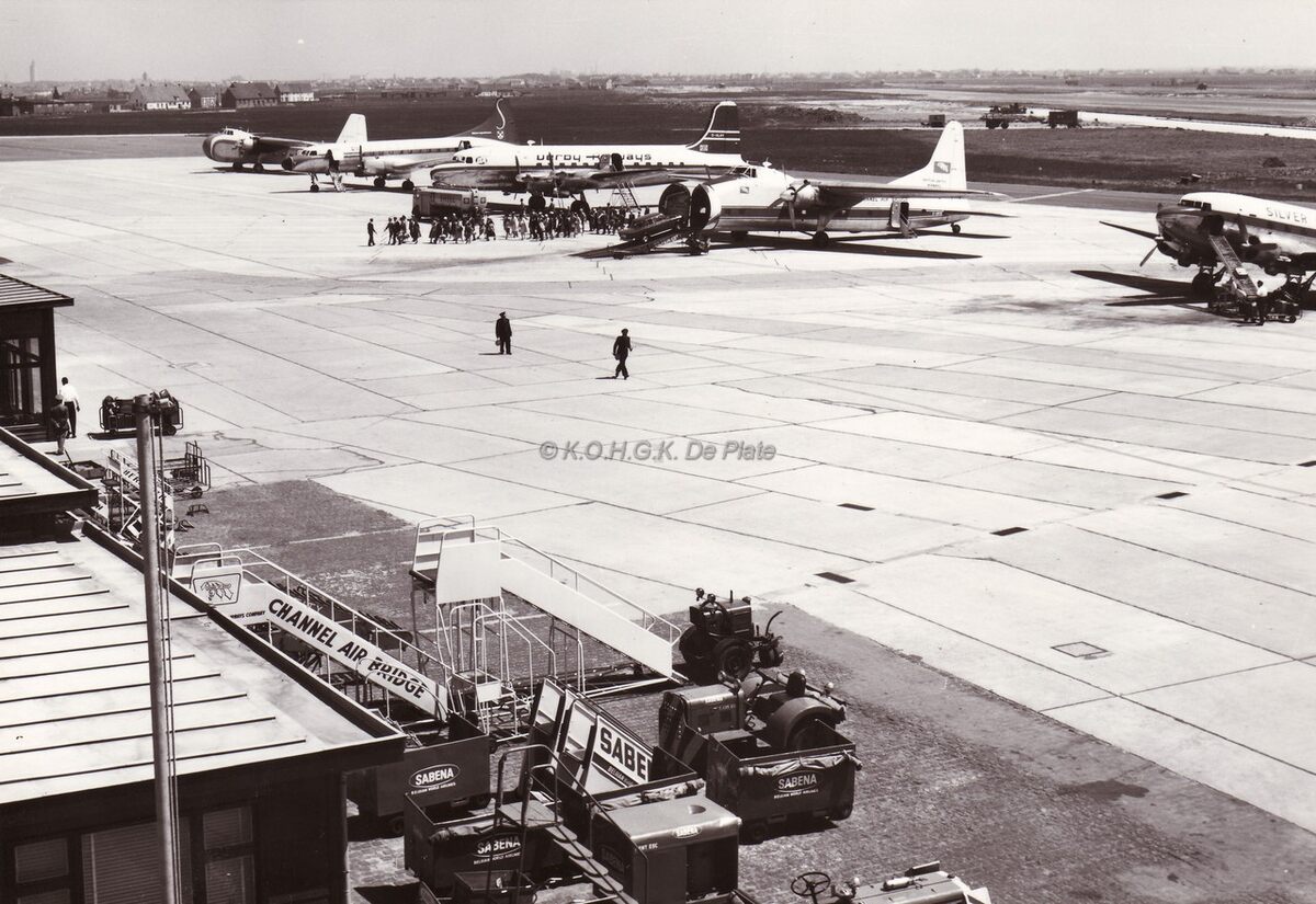 De passagiers uit een net geland toestel gaan naar het luchthavengebouw.Foto vanop het terras of vanuit de controletoren richting stad Oostende.Rechts een DC3 van Silver City.