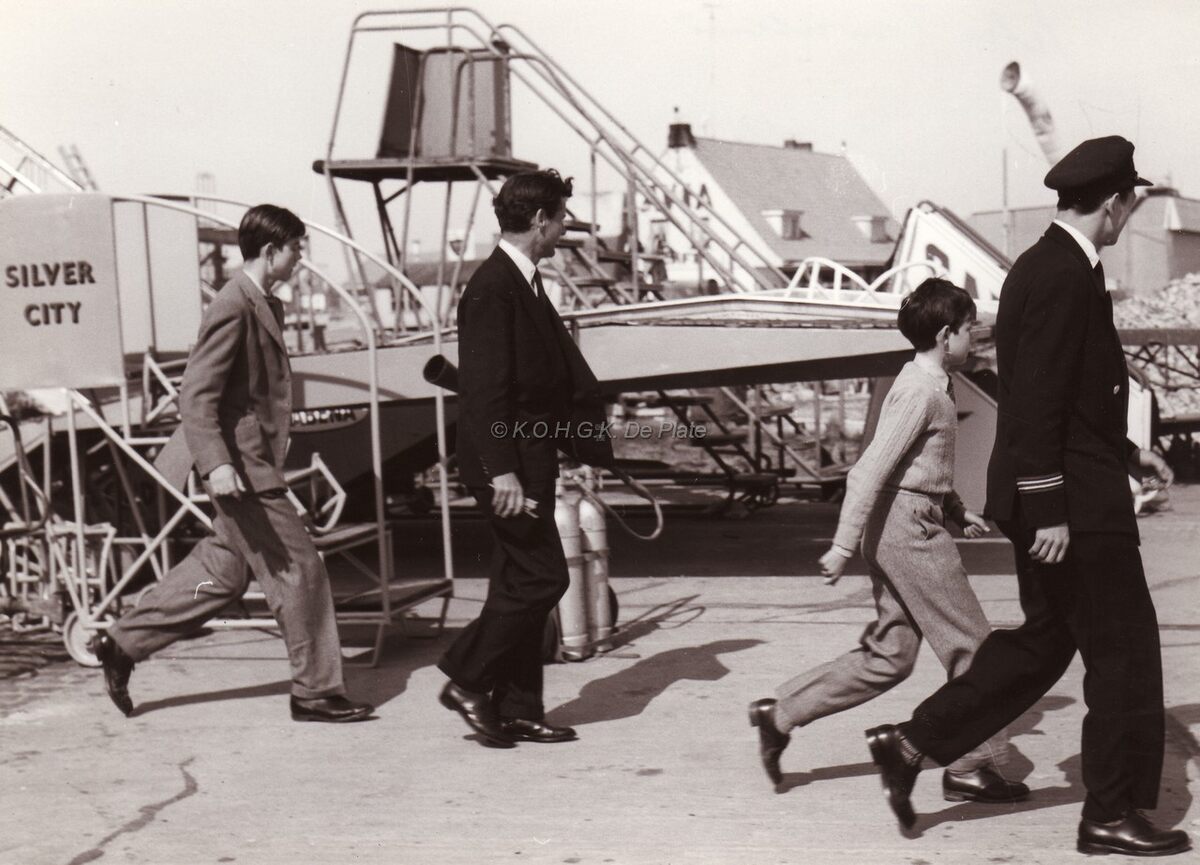 Enkele passagiers op weg naar hun wachtend vliegtuig.Naast hen een laadhelling en mobiele trappen.