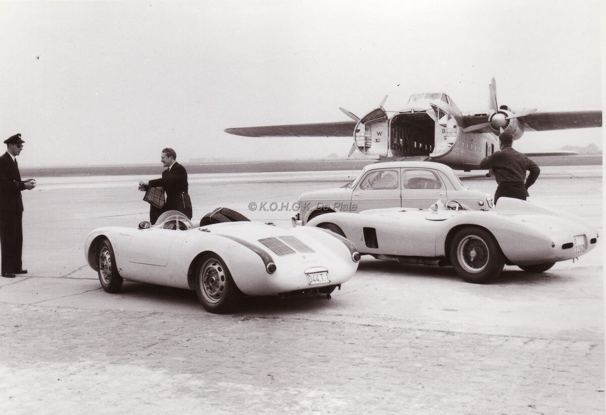 Een paar racewagens (en een gewoon wagentje) klaar op het vliegveld om ingeladen te worden voor een vlucht over het kanaal.