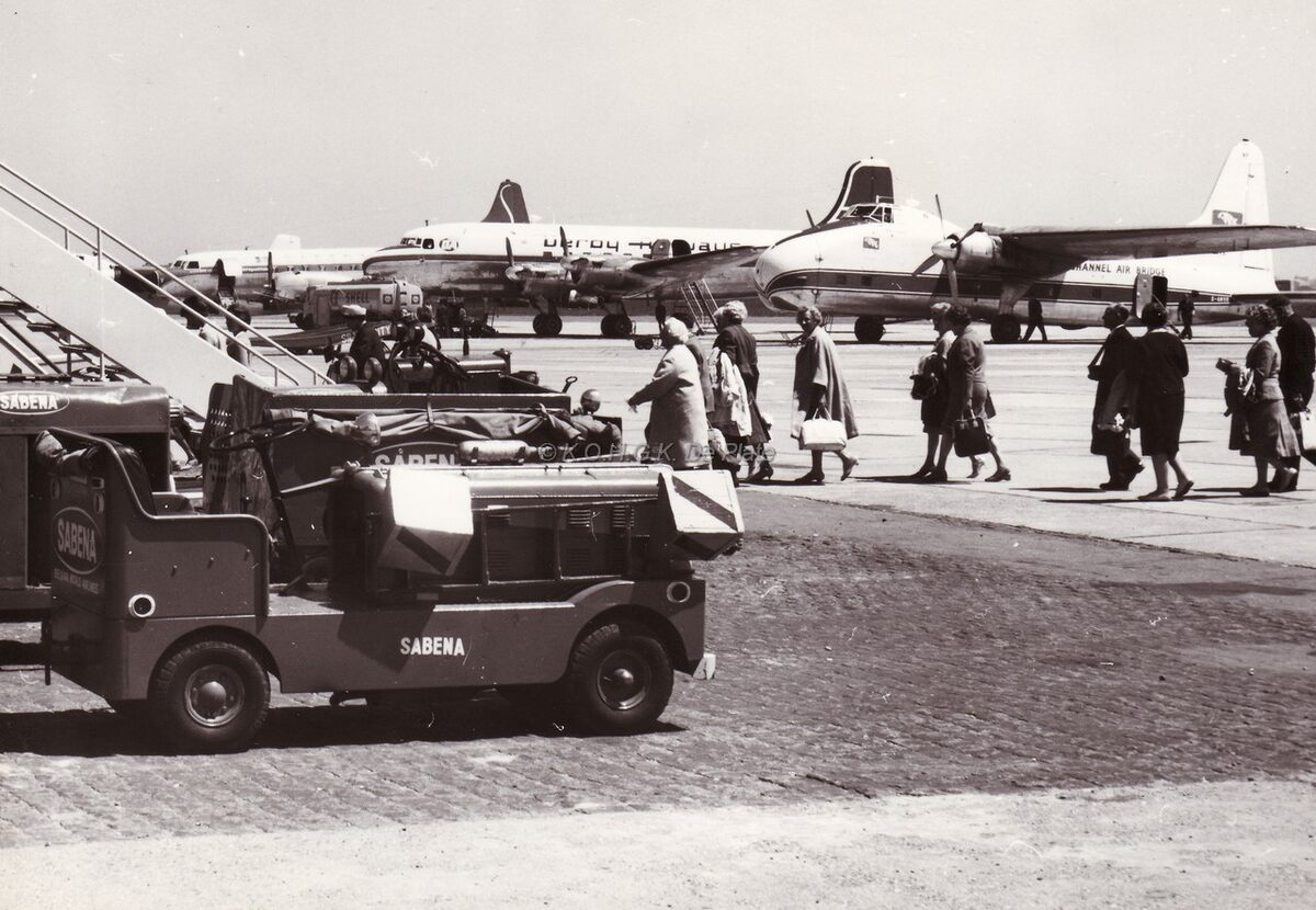 Een groep pas gelande passagiers gaat het luchthavengebouw in.Op de achtergrond rechts een Bristol Freighter van Channel Air Bridge.