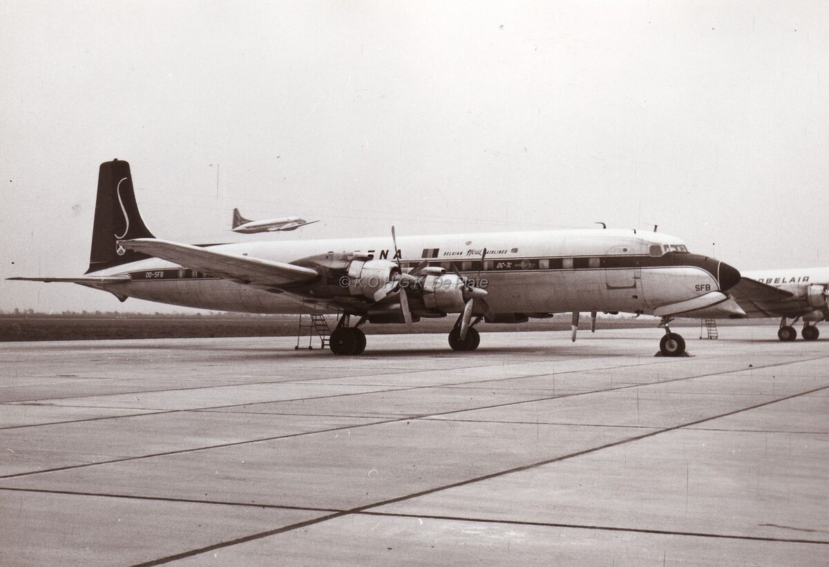 Een DC4 van Sabena op de tarmac van de Oostendse luchthaven,er naast staat een toestel van Sobelair.