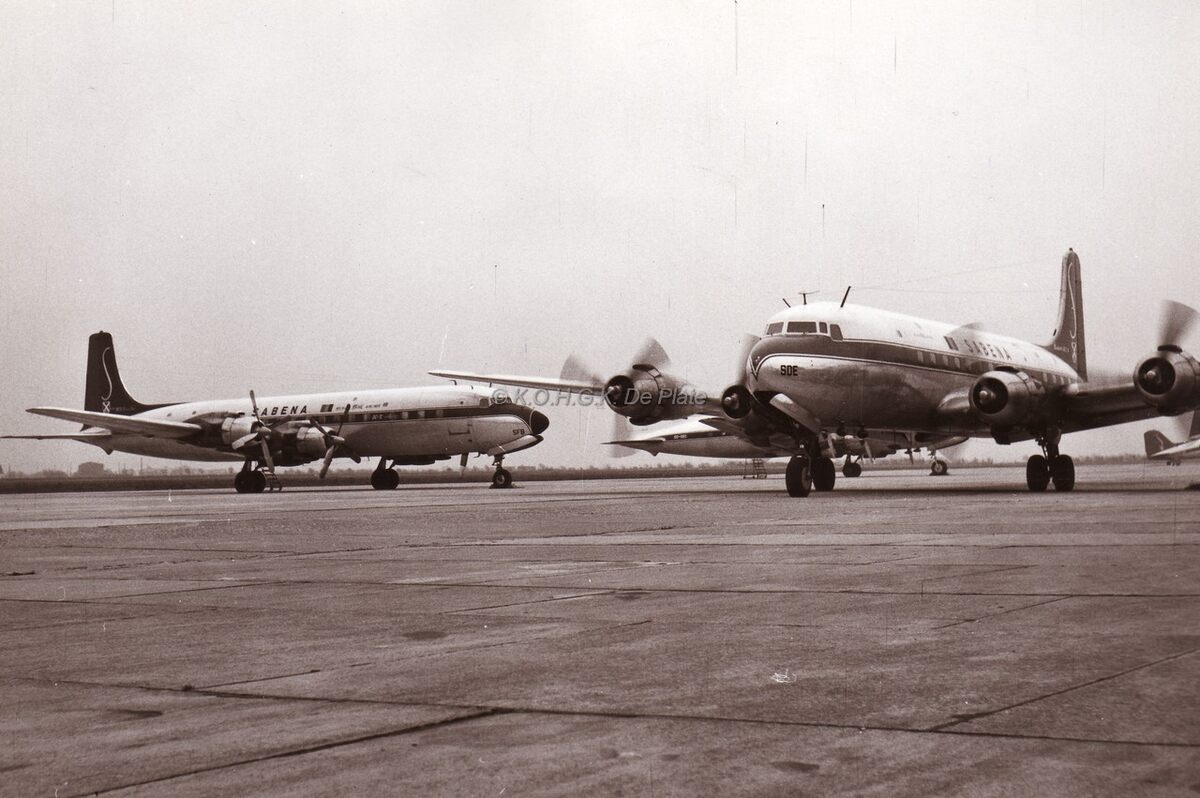 Een DC4 van Sabena taxiet na de landing op het Oostends vliegveld naar zijn standplaats.Links een gelijkaardig toestel.