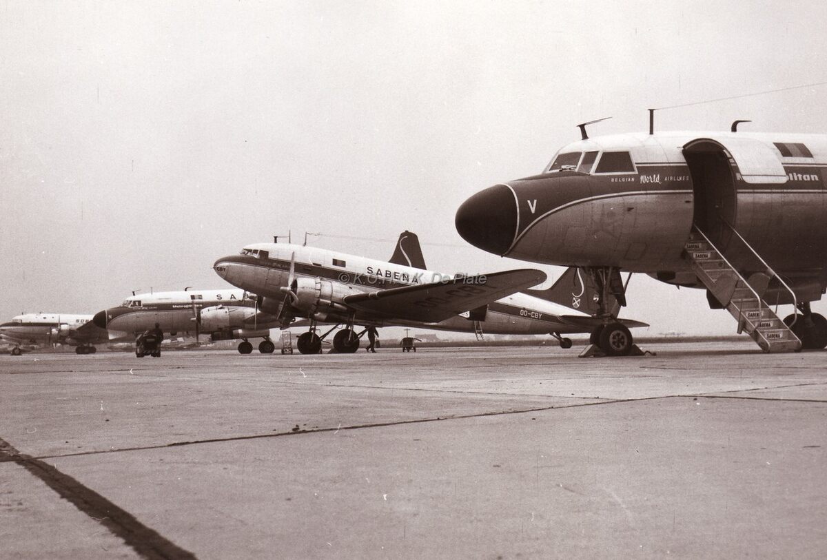 Een rij vliegtuigen op de Oostendse luchthaven. De eerste drie van Sabena, een Convair 440 Metropolitan, DC3 en weer een Convair 440 Metropolitan. Het vierde toestel is van Sobelair. (Met dank aan de heer Tom Bergen)