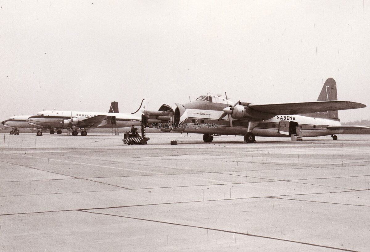 Een Bristol Super Freighter van Sabena wordt geladen op het Oostendse vliegveld,er naast een DC4 van Sobelair.