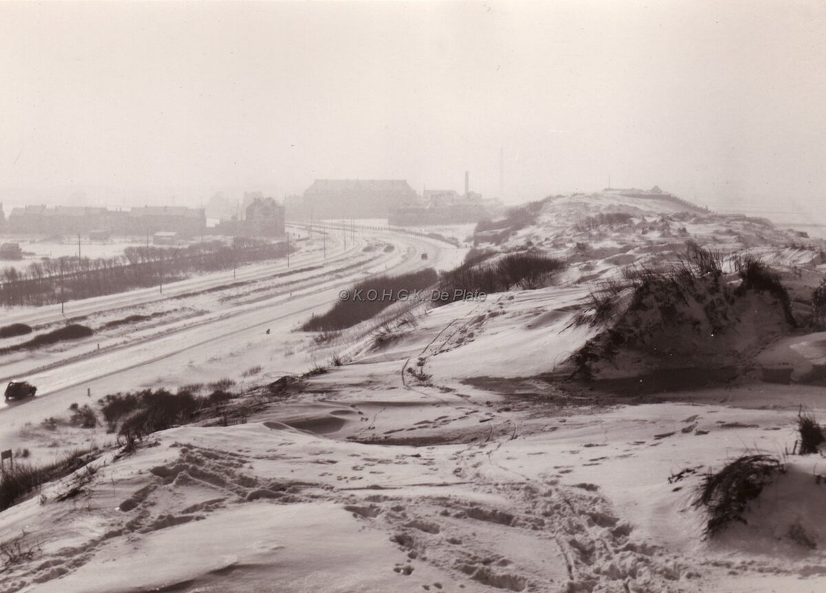 Besneeuwde duinen langs de Koninklijke Baan te Bredene. Foto richting Oostende. Rechts, aan de bocht, het Zeemanshuis Godtschalck en het Militair Hospitaal. Links, de Groenendijk met op de hoek "Café Groenendijk"