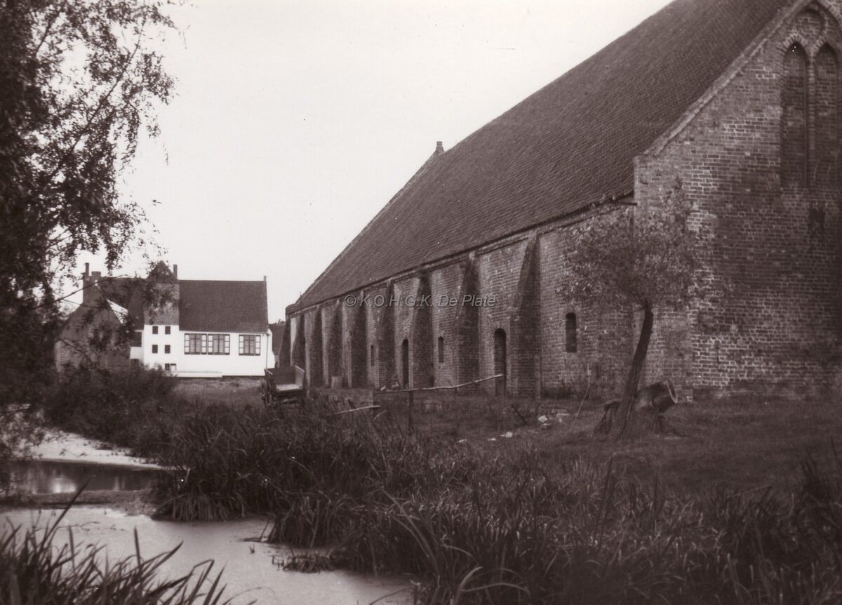 Middeleeuwse schuur (Ter Doest) te Lissewege.Op de voorgrond centraal een oud kanon (mortier ?).