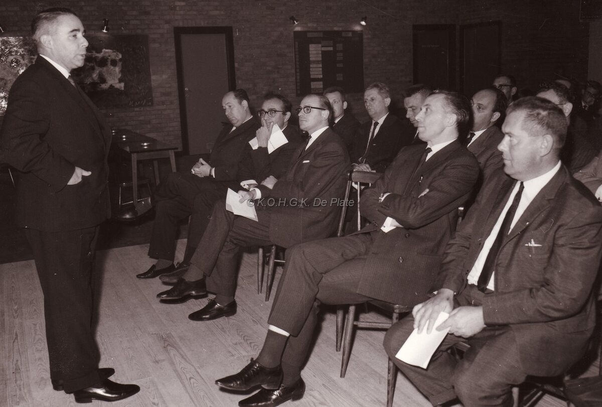 Schepen Raymond MIROIR houdt een toespraak bij de opening van het vrijzinnig jeugdhuis CASA aan het Ernest Feysplein.Op de voorgrond Alfons GOES,kantonnaal inspecteur van het lager onderwijs,dan schepen Alfons LARIDON,onbekend,schepen Jan FELIX en John HERMANS,journalist en gemeenteraadslid.