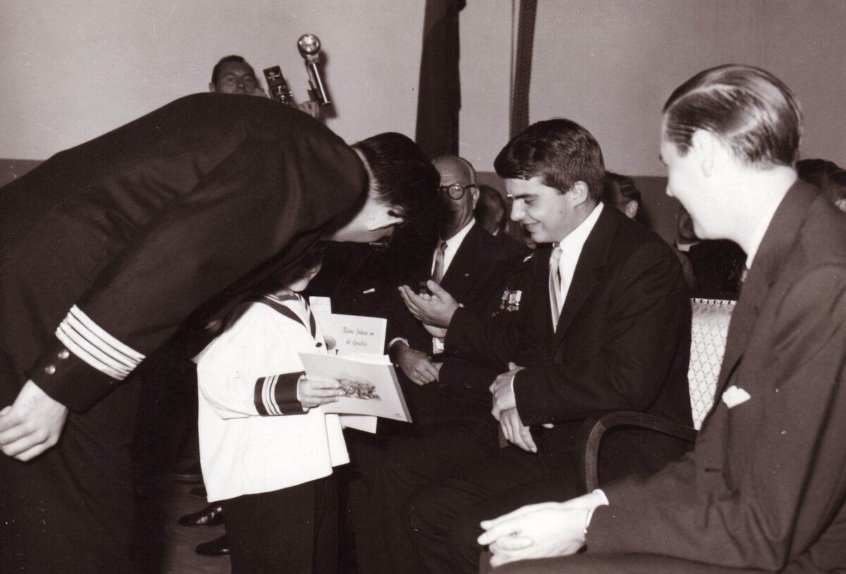 De leerlingen verwelkomen Prins Alexander. Rechts burgemeester Jan Piers